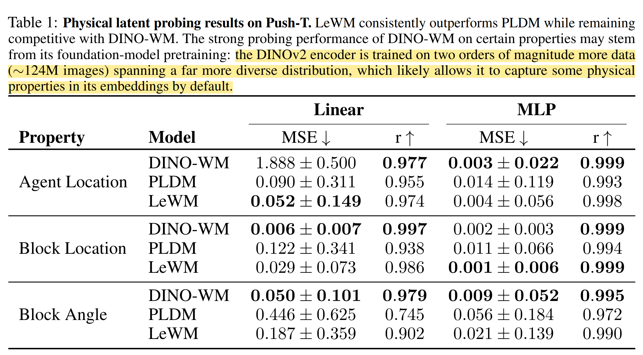 物理定量探针测试,WN常见的测试,让模型推理出环境的空间度量信息,比如这里就是测量突击之间的位置、角度。我觉得Linear更有说服力。我认为这个结果表明DINO预训练真的是为模型注入很强的环境表征能力,不知道LeWM如果scale up到一样测参数量之后会不会更强?