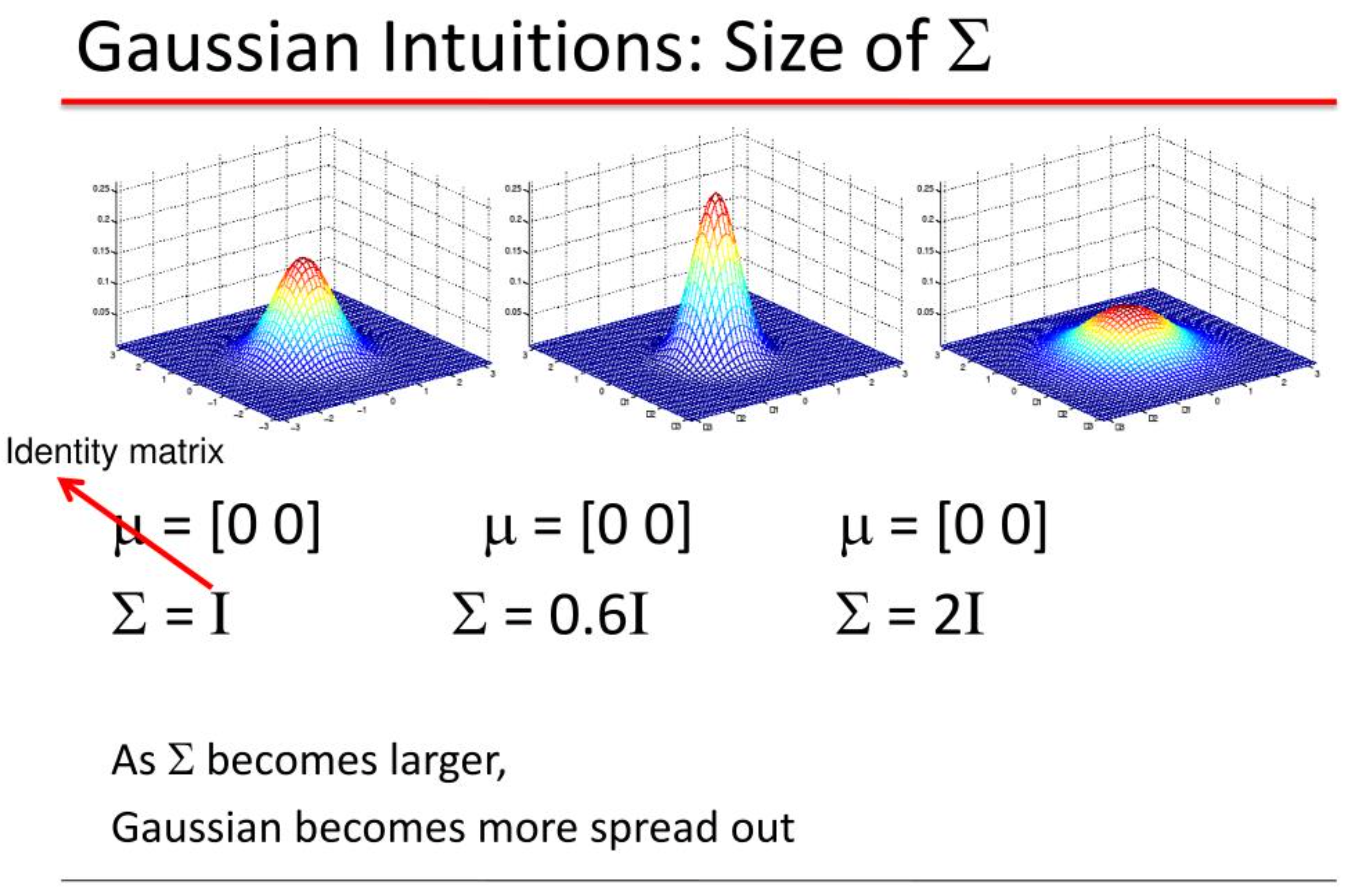 而多维的高斯分布是“N维空间中的山,多维,中心峰的仍然是μ,仍表示分布的均值,不过μ为N维向量;山峰的宽度受协方差∑控制,∑是分布的协方差矩阵(性质:正定(特征值全是正数)对称的)。”