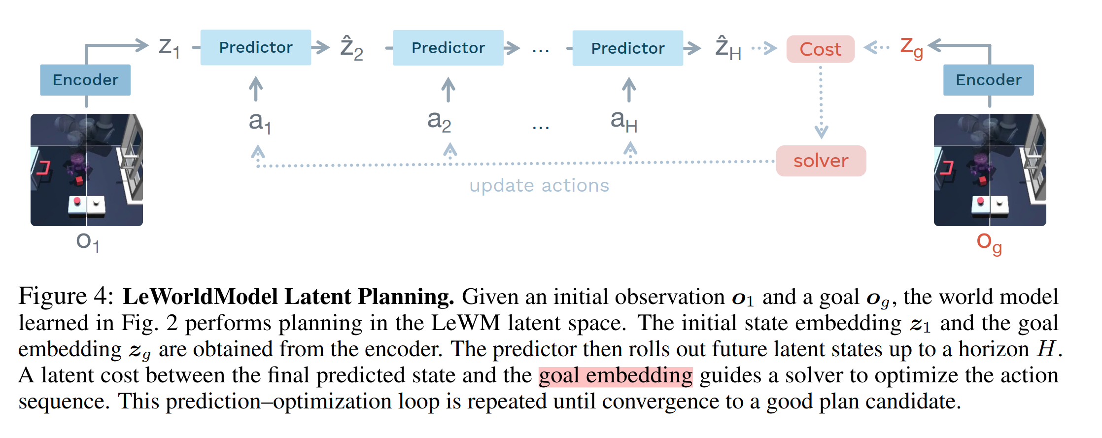 在embedding(latent)空间,考虑上一个latent与action,预测下一个latent,然后实施action,与新观测得到的latent对比,计算MSE,优化encoder。这与当下主流WM的做法是一样的;