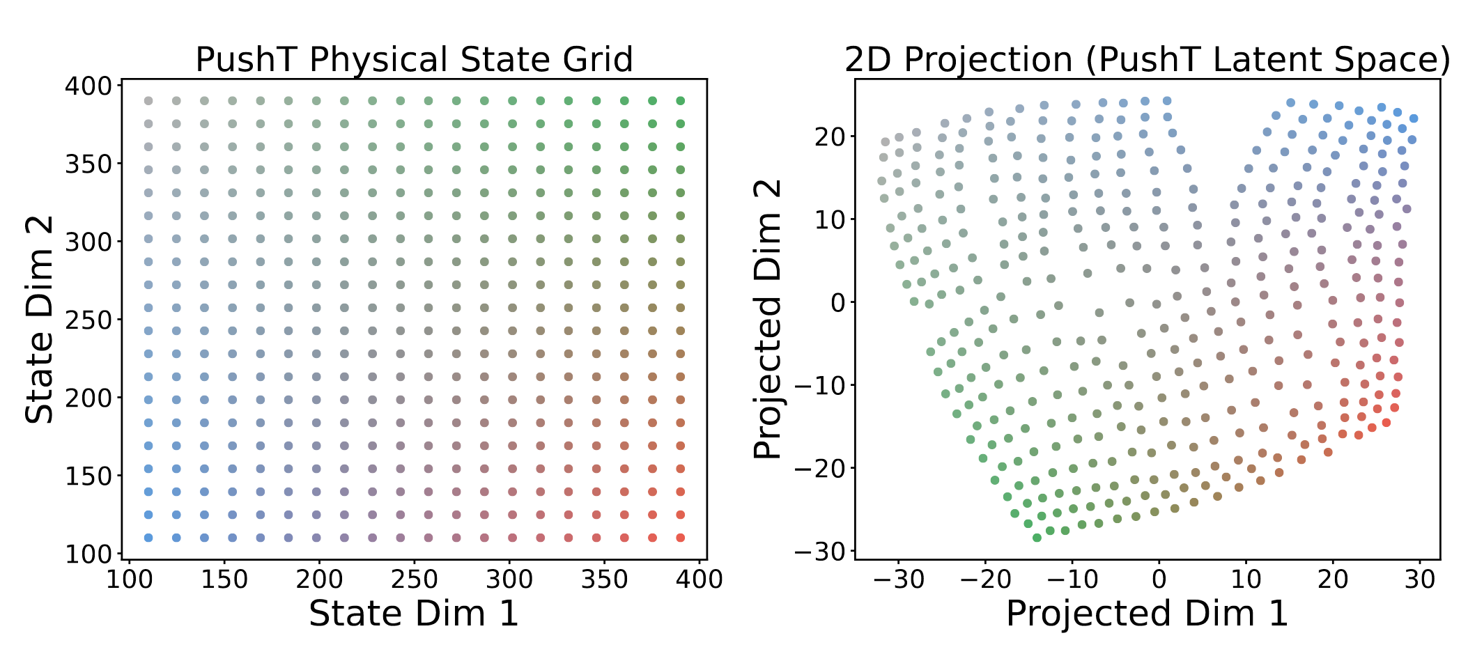 环境表征映射到latent space后,保持了接近的相对结构。但我认为这种低维可视化的说服力有限,只能说没出现高维折叠。