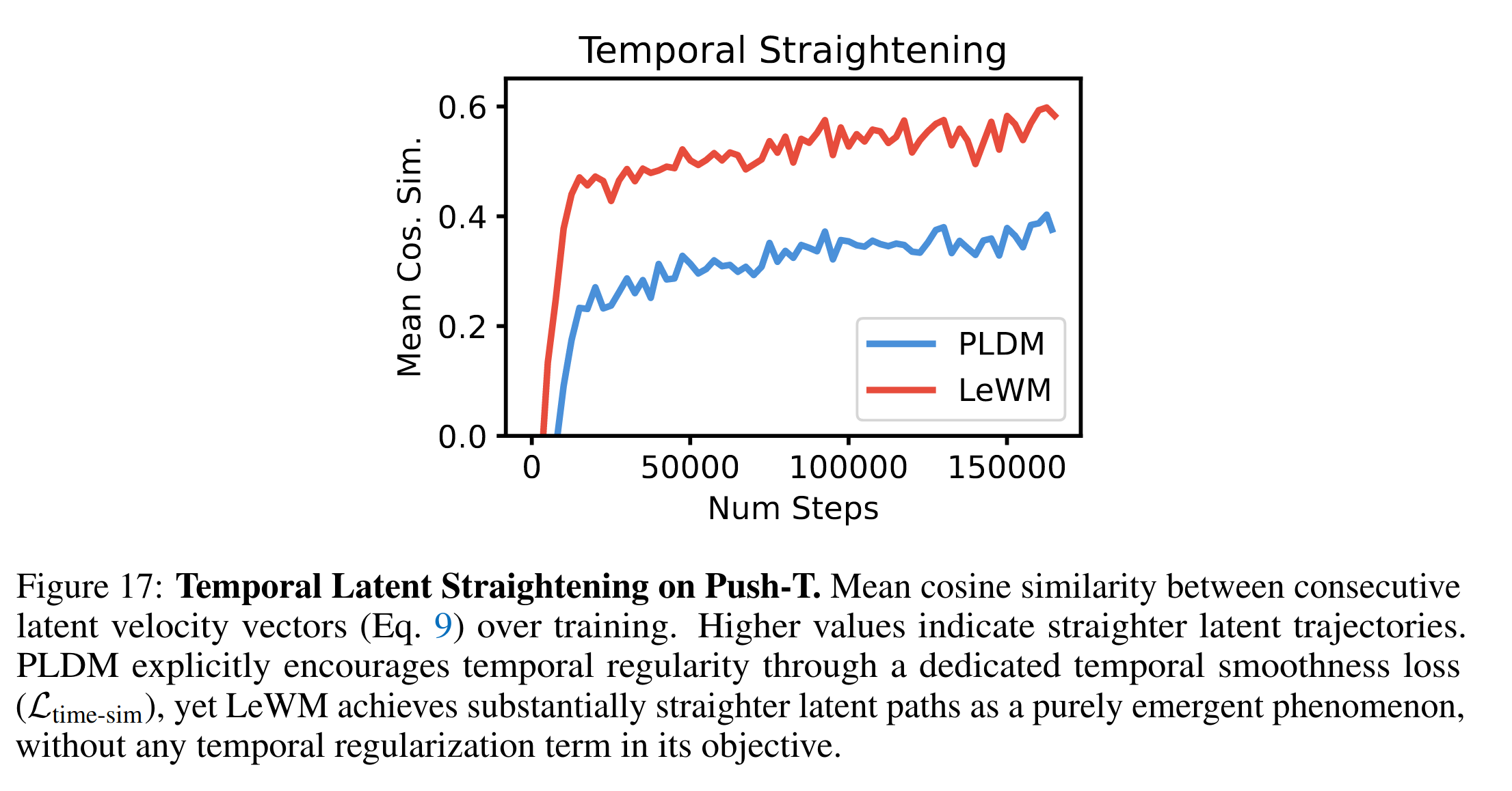 这个我认为是最有意思的,LeWM在没有显式加任何smoothness loss的条件下,涌现出了轨迹平滑的能力。我认为这种能力很可能来自正则化下的紧凑JEPA潜码压缩:历史轨迹越平滑,下一步要处理的问题越简单,越能节约latent表征能力,所以predictor引导模型走出了越来越平滑的轨迹。