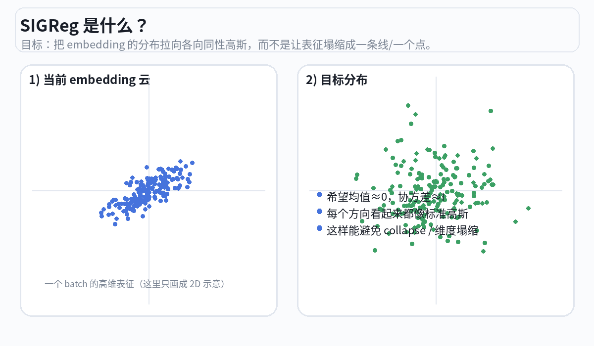 为什么SIGReg有效?因为它解决了表征中的两种坍缩——如果 embedding 的分布是 N(0, I),意味着:每个维度的方差都是1(不会有维度"死掉"→ 防止维度坍缩);不同维度之间不相关(没有冗余 → 防止信息冗余坍缩)。