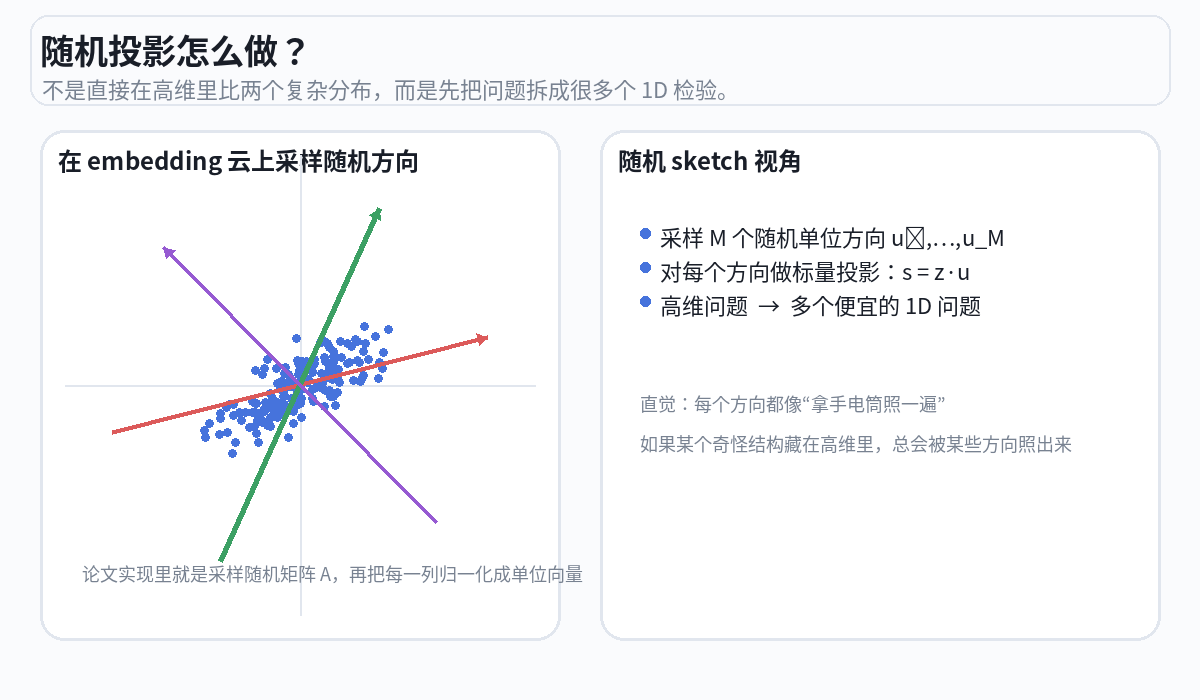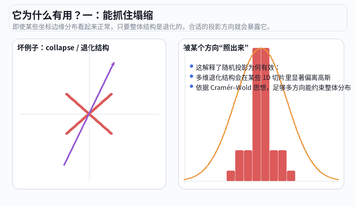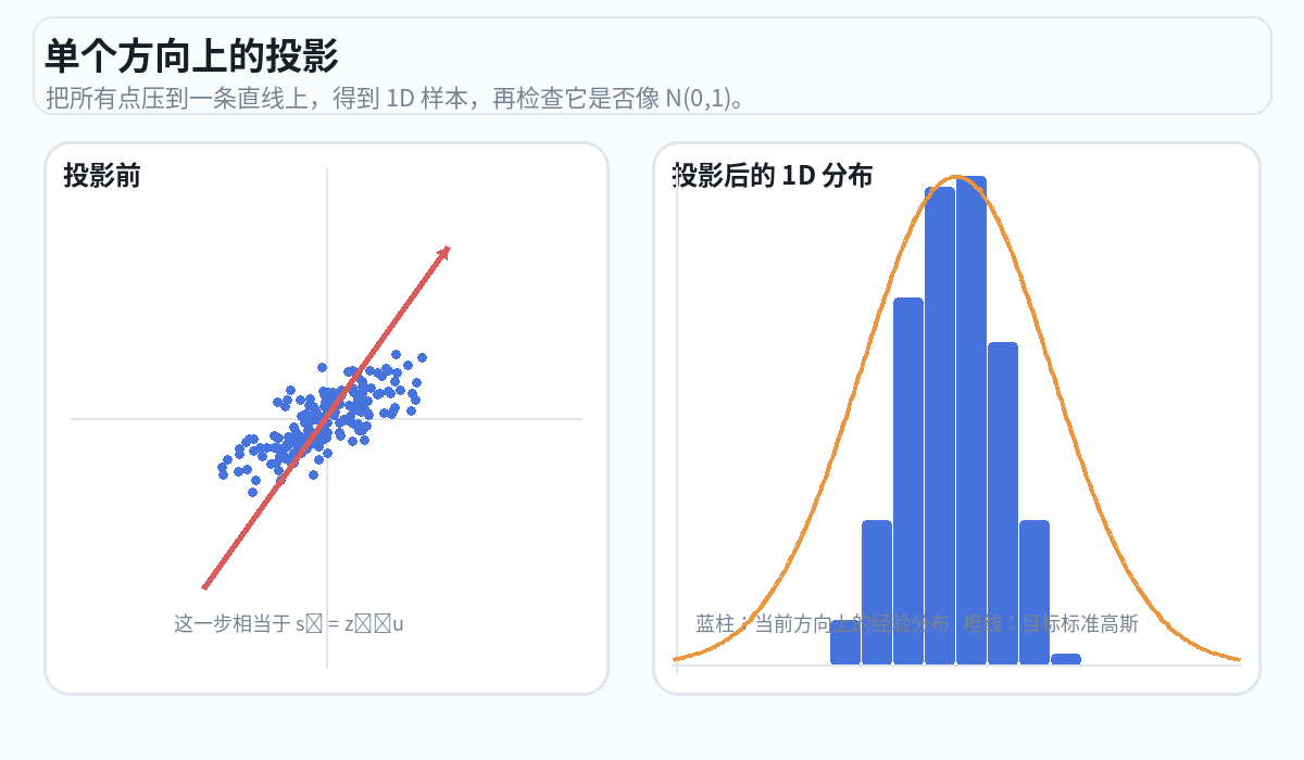 这个方法之所以在数学上成立,是因为 Cramér-Wold 定理:如果从每一个方向看投影都是标准正态分布,那么原始的高维分布就一定是各向同性高斯。