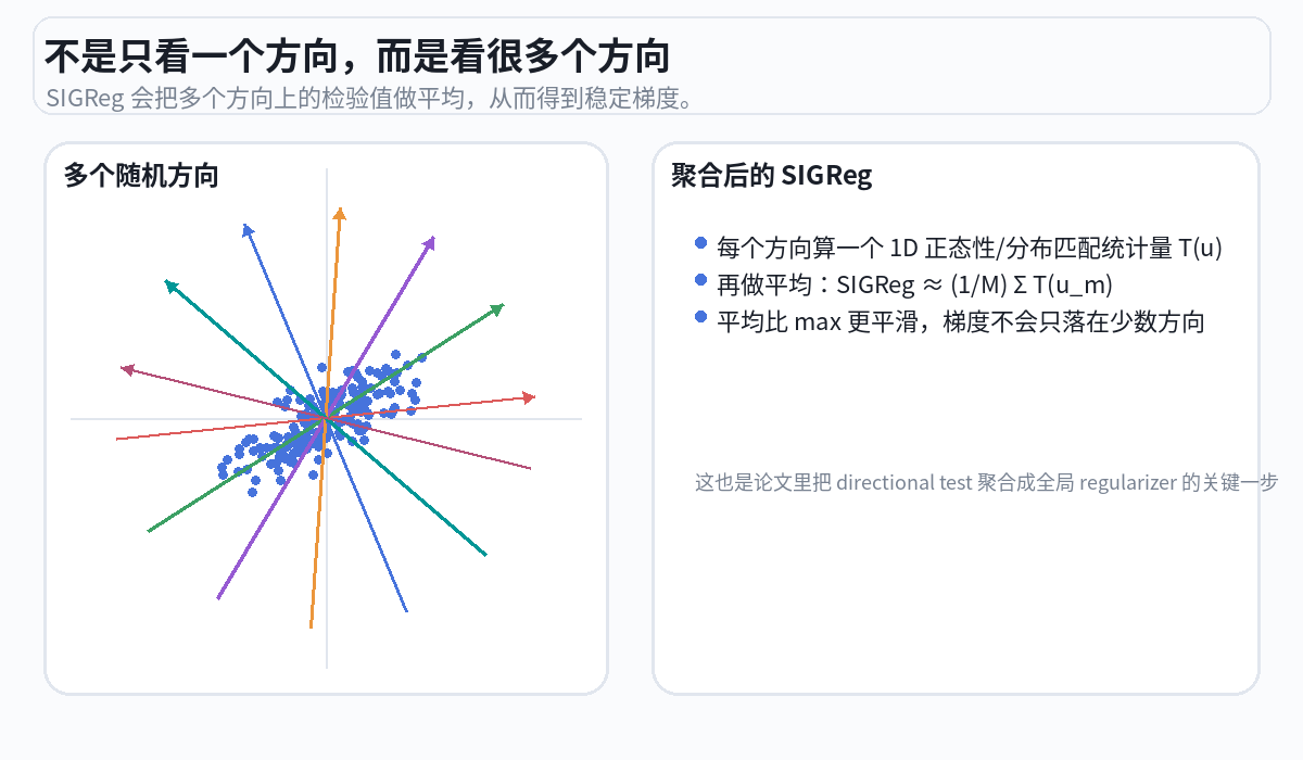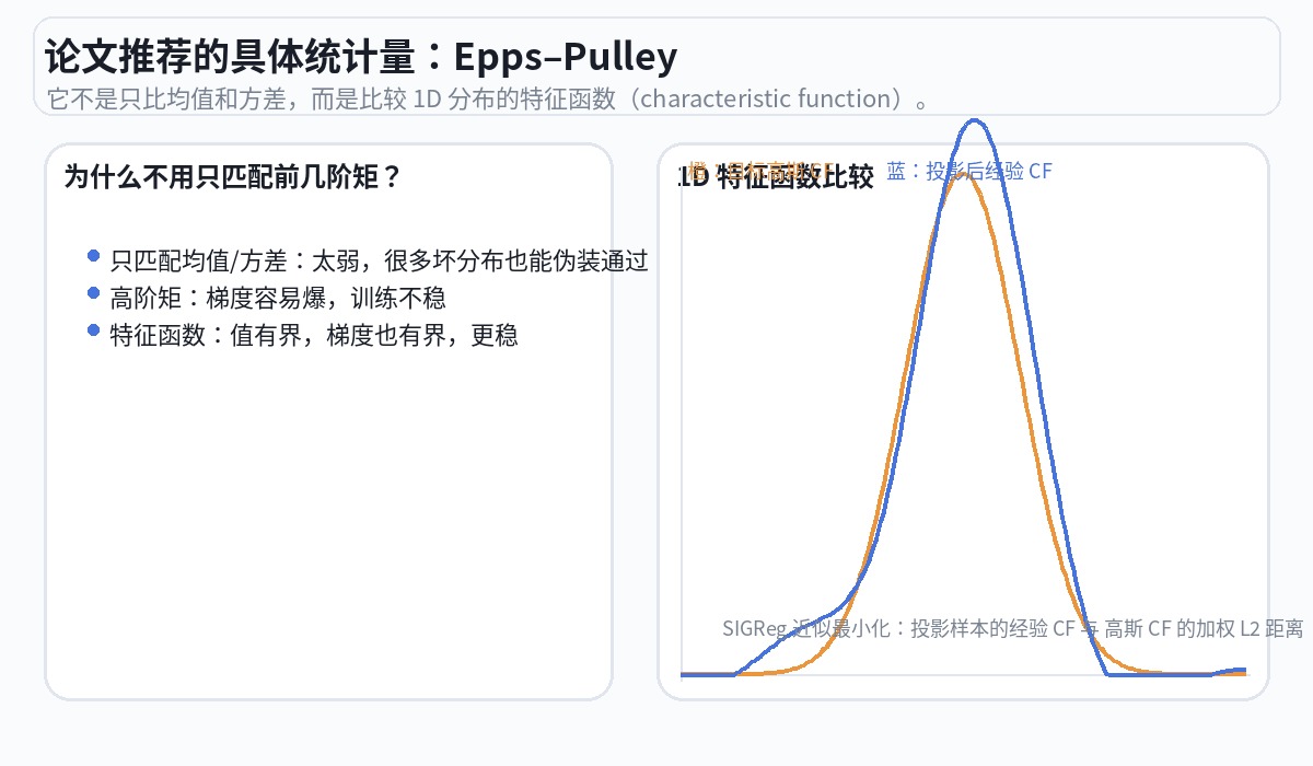 对每个投影方向,SIGReg 用 Epps-Pulley 检验来评估"这个一维投影的分布有多接近标准正态"。如果接近,得分低(好);如果影子挤成一堆,得分高(差,需要惩罚编码器)。
