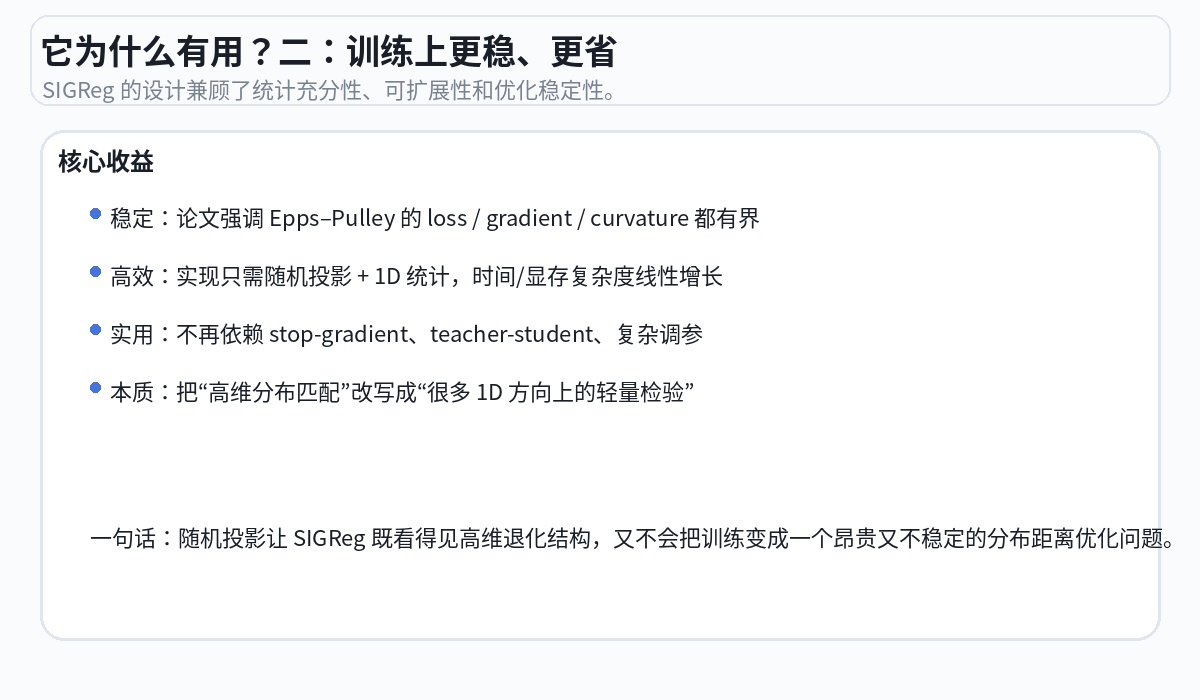 好的状态:投影后的分布 ≈ 钟形曲线 → SIGReg loss 低 → 编码器没有偷懒 坏的状态:投影后的分布 = 一个尖峰 → SIGReg loss 高 → 编码器在偷懒,需要惩罚。
