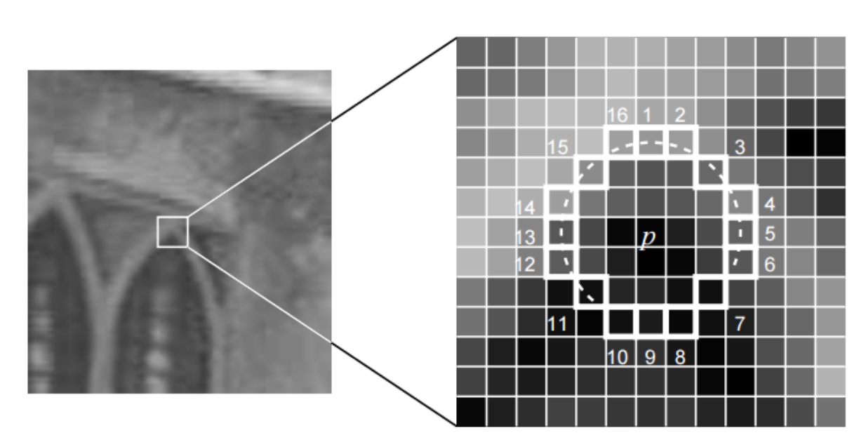 FAST 是一种角点,主要检测局部像素灰度变化明显的地方,以速度快著称。它的思想是:如果 一个像素与邻域的像素差别较大(过亮或过暗),那么它更可能是角点。相比于其他角点检测算法, FAST 只需比较像素亮度的大小,十分快捷。